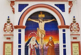 En la Calle San Vicente, sobre la fachada del Convento de San Antonio de Padua, nos encontramos este complejo retablo cerámico donde podemos ver a San Francisco de Asís como santo inspirador de la obra de la Hermandad, acompañando al Cristo del Buen Fin y a Nuestra Señora de la Palma, como imágenes titulares de la Hermandad franciscana del Buen Fin con sede canónica en dicho edificio conventual.