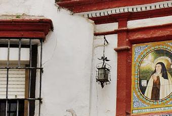 Sobre los muros exteriores del Convento de San José del Carmen (más conocido como Convento de las Teresas) nos encontramos con este retablo cerámico dedicado a la santa que le da nombre a la calle y fundadora del convento: Santa Teresa de Jesús.
