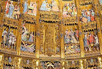 Se consigue así una valoración del tabernáculo como centro del conjunto, aspecto reforzado por el programa ieonoaráfico cuya lectura no sigue la normal alineación horizontal, sino que adopta un sistema radial: el cicío de la Infancia forma un arco interior —Anunciación, Presentación del Niño en el Templo. Nacimiento, Matanza de los inocentes y Epifanía—;y en la haca exterior, el ciclo de la Pasión a la izquierda, de abajo arriba —Flagelación, Ecce Homo, Camino del Calvario y Piedad—.y el cielo de la Glorificación a la derecha, en dirección descendente —Resurrección. Ascensión, Pentecostés y Resurrección de los muertos o Juicio Final.