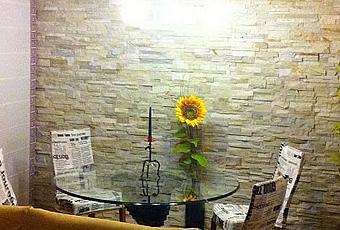 Háblanos de tu rincón favorito Esta foto pertenece a un "rincon" del cuarto de estar-comedor. Las sillas estan tapizadas simulando un papel con un texto en varios idiomas. La alfombra esta formada por flores blancas de colores (y una roja). La pared esta decorada con piedra real. El arbol y el girasol, son de mentira. El arbol tiene 3 racimos de uvas de cristal naranja. A un lado se puede ver un radiador negro de pared, y al otro una lampara 'antigua' verde, con una vela de 'imitacion'.