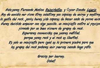 "Hola, somos Fernando Madina de Reincidentes y Óscar Sancho de Lujuria. Nos da envidia ver cómo otros colectivos son capaces de unirse y nosotros, la gente del rock, jamás hemos sido capaces de hacer nada de forma unida. Hemos decidido empezar con algo sencillo. Un manifiesto contra el fascismo firmado por un buen número de grupos de rock. Esperamos convencidos que seamos multitud, porque somos rock y el rock es libertad. Es solo un manifiesto pero igual es la primera piedra para que los grupos de rock podamos unir fuerzas cuando haga falta. Gracias por leernos. ¡Salud!"Si tienes una banda de rock o eres un medio de rock y crees que hay que parar el fascismo, contáctanos. ES EL MOMENTO Y VAMOS A SER MULTITUD! pic.twitter.com/0dxKWqAZO9