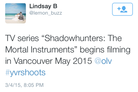 Según parece la industria Lemon_Buzz ha dejado caer a través de Twitter que el rodaje de Cazadores de Sombras comenzará en mayo ¡solo faltan dos meses! Al fin un sueño mas cumplido para los Nefilims *bailo de felicidad* Además han confirmado que, al igual que sucedió con la película, la localización será Vancouver.