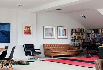Lo que más me ha gustado de este espectacular ático han sido el salón y la habitación principal, con sus impresionantes techos abuhardillados y enormes ventanales que lo llenan de luz. El detalle de las estructuras de madera vista es también uno de los puntos fuertes de la vivienda, es realmente preciosa no creéis?