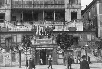 El Salón Pradera fue construido en el centro de la ciudad, terrenos del antiguo castillo-cuartel de San Felipe. Inaugurado el 1 de julio de 1908, al principio programaba Cinematógrafo alternando con espectáculos de variedades, bailarinas, cupletistas, calzonetistas, etc., y varias temporadas de zarzuelas. Muy poco después abriría el Salón Apolo. En la foto-postal podemos ver la antigua plaza de las Farolas, el Salón Pradera y el Palacio Episcopal al fondo. Según escribe J.R. Sáiz Viadero el cinematógrafo hizo su presentación en Santander en el pabellón Lumiere durante los festejos estivales en fecha 24 de julio de 1896. Román Arce Martín (1883-1938), un actor cómico que procedía de las compañías de teatro de aficionados locales se convertiría pronto en el Salón Pradera en el más famoso explicador de su época, pasando después a escribir obras teatrales, estrenar zarzuelas y dirigir e interpretar la primera película argumental que se rodó en Santander: el cortometraje titulado `Cómo compré un gabán` (1914). El Salón Pradera se mantuvo abierto hasta 1919, siendo posteriormente demolido para construir en su solar la sede del Banco de España.