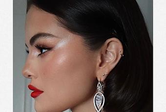 Aunque su maquillaje preferido es el no-makeup makeup, para Selena se inspiró el look Old Hollywood de los años 60 con labios rojos, pestañas postizas y sombras en colores terrosos.