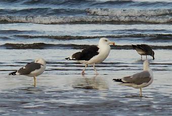 El señor gavión se siente tranquilo, a su lado el resto de gaviotas parecen pequeños liliputienses. Durante estos días último del otoño el litoral asturiano va siendo ocupado por estos señores gaviones, grandes machos llegados del norte de su área de cría. Grandes, negros, potentes, son los láridos de mayor tamaño, y su hallazgo es siempre motivo de asombro y regocijo.