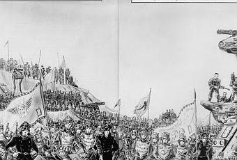 Lo que tenemos aquí para ir abriendo el día es una imagen sacada de la WD 113 UK(Mayo de 1989).Estas son las paginas 64 y 65 de publicación y es una ilustración realizada por Peter Knifton que ilustra la compañía D del 7° Regimiento de Mordion durante la pacificación de Flotis III.Es uno de los primeros regimientos nombrados de la G.I y muchos piensan que es el antepasado directo de los Mordianos,por el parecido en los nombres(Mordion,Mordia,...).No hay mas información sobre ellos que la que sale en estas paginas me temo,pero es bastante pese a todo y nos habla de sus origines:El 7° regimiento fue creado a partir de una de las bandas de una de las ciudades colmena de ese platera,los Night Rippers por su simbolo del puño alzado con un cuchillo curvo de hoja negra y filo rojo.Flotis III fue su primera acción de combate.
