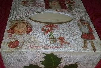 De esta manera Loli nos cuenta cuál ha sido la técnica para la realización de este decorativo servilletero navideño: "Mira, el trabajo se llama DECOUPAGE, si no lo conoces es como se le llama a los trabajos realizados con recortes de servilletas, papel de arroz ..... El servilletero estaba en bruto y le dí dos manos de gesso, imprimación, después pinté con color blanco acrílico y una vez seco pegué los motivos que los corté de una servilleta de navidad. Luego le utilicé craquelador de dos pasos y finalicé con betún de judea."