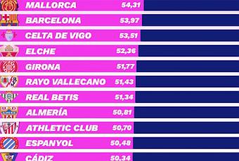 La lista está encabezada por el Real de Madrid, con 56,32 minutos de media, mientras que el Valencia es quien cierra este particular ranking, con 46,54 minutos de media por encuentro, es decir 4 minutos menos que en los encuentros del Sevilla.