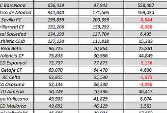 El Sevilla FC ocupa la cuarta posición de este particular tabla clasificatoria con un total de 199,855 millones de euros, superado esta temporada al Villarreal en 48 millones de euros. En 65 millones a la Real Sociedad y al eterno rival en más de 100 millones de euros.
