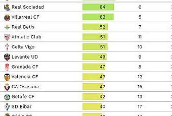 El CIES Football Observatory lo sitúa en la cuarta plaza de LaLiga con 67 puntos