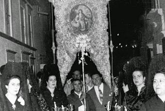 El Simpecado blanco de lamé de plata es el reservado para los Rosarios de gala, los que se celebran durante la celebración de los cultos principales. En esta fotografía de 1953 lo vemos presidiendo el Santo Rosario por la calle Pastora Solís, vemos como las participantes llevaban velas alumbrando a la Virgen, costumbre actualmente perdida a pesar de que en algunas casas se conservan todavía algunas de estas piezas con guardabrisas de cristales de colores que impedía que la cera manchase el suelo o a la persona que lo portase.