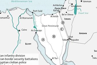 El Sinaí estuvo ocupado por Israel en el contexto de la guerra de los Seis Días y, tras los acuerdos de Camp David, pasó de nuevo a manos egipcias, pero con matices: se dividió administrativamente en cuatro zonas. Las zonas A y B, en el oeste y centro de la península, están bajo control total egipcio. Sobre la zona C, que ocupa toda la zona este, tienen derecho a actuar la policía egipcia y la llamada Fuerza Multinacional de Paz y Observadores, un cuerpo de vigilancia del alto el fuego y desmilitarización de la región establecido tras los acuerdos de Camp David y que, aunque tanto Israel como Egipto estaban de acuerdo con su creación, se constituyó al margen de la ONU porque se temía el veto de la URSS. Por último, la zona D bordea la frontera con Israel y es precisamente este país el que tiene derecho a desplegar batallones en el área, por lo que los movimientos del ejército egipcio quedan limitados.