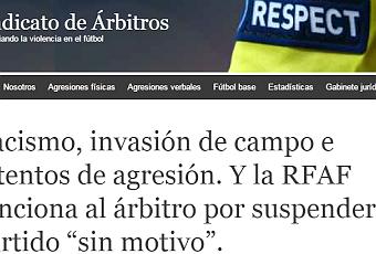 En el descanso me percato que dos aficionados, siendo identificados como aficionados del equipo local por sus cánticos y sus gritos, se colocaron en la bocana de vestuario al lado de mi asistente número 2 amenazándolo con insultos racistas diciéndole: “Tú lo que eres un moro de mierda” y con que lo van a agredir alzando el puño en alto en forma de amenaza con agredirlo físicamente sobre su rostro, llegándole a lanzar el puño sin llegar a impactarle.En el minuto 72 me llama mi asistente número 1 para comunicarme que un aficionado se le dirige con insultos racistas en los siguientes términos: “Tú lo que eres un machupichu de mierda”, “Lo que tienes que hacer es irte a tu país machu de mierda”, llegándole a escupir dos veces en la espalda.El encuentro se suspendió en el minuto 77 debido a que invadieron el terreno de juego varias personas identificadas como aficionados del equipo local debido a sus indumentarias, porque poseían el escudo del equipo local, empezando una trifulca con los jugadores del equipo visitante, intentándolos agredir y amenazándolos. Viendo lo ocurrido en el terreno de juego doy por suspendido momentáneamente el encuentro viendo que peligraba la integridad física de los jugadores del equipo visitante, mis dos árbitros asistentes y mi integridad física. Una vez en el vestuario comunico al delegado del equipo local que llame a las fuerzas de orden público para intentar reanudar el encuentro. Pasados varios minutos en el vestuario arbitral, se presenta el señor _________________, identificándose como presidente del club local y comunicándome que han llamado a las fuerzas de orden público y que no sabe si van a poder presentarse en las instalaciones. Pasados unos 15 minutos desde que se presentó el presidente del equipo local y viendo que no aparecía ninguna persona de las fuerzas de orden público me percato yo personalmente a llamarlas para poder saber si se iban a presentar en las instalaciones, comunicándome las fuerzas de orden público que no habían recibido ninguna notificación ni llamada del presidente del equipo local sobre lo sucedido y presentándose a los 7 minutos después de mi llamada las fuerzas de orden público. Una vez que se presentan las fuerzas de orden público en las instalaciones me comunican que no pueden permanecer en ellas, no pudiéndome asegurar mi seguridad ni la de mis asistentes durante lo que restaba de encuentro, teniendo que dar el partido por suspendido finalmente, acompañándonos hasta el vehículo arbitral.EL SINDICATO DE ÁRBITROS PIDE LA DIMISIÓN DE EDUARDO HERRERA Y SU JUNTA DIRECTIVA. ...con este vergonzoso relato en el que encontramos intentos de agresión, invasiones de campo, el engaño del presidente local, la imposibilidad de garantizar la integridad de los asistentes por parte de las FOP y un racismo que ya es motivo suficiente para suspender un partido, el Comité de Competición decidió sancionar al árbitro con una multa económica y un mes de inhabilitación, además decidió reanudar el partido cargando los costes al Comité de Árbitros. El motivo, que el árbitro no tenía motivos para suspender el partido y no agotó todas las opciones, increíble. Lean la resolución:POR PARTE DE ESTE COMITÉ SE ACORDO EN LA REUNION DEL PASADO 03/03/16 :1º.- DAR TRASLADO A AMBOS CLUBES Y AL ARBITRO DEL PARTIDO PARA QUE EN EL PLAZO DE TRES DIAS REALIZARAN LAS ALEGACIONES QUE A SU DERECHO ESTIMASEN OPORTUNAS.2º.- SE ACUERDA CITAR ANTE ESTE ORGANO EL MIERCOLES 09/03/16, A LAS 18;15 HORAS A D. _____________________________ (ARBITRO DEL PARTIDO), Y A LOS DELEGADOS DE AMBOS CLUBES D. ___________________________ (FLORIDA C.D. U.D.) Y ______________________ A. (C.D. GUADIARO).EN EL EXPEDIENTE CONSTAN LAS ALEGACIONES COMO ASI MISMO LAS PRUEBAS TESTIFICALES REALIZADAS.A LA VISTA DE ELLO SE ACUERDA:1º.- LA REANUDACION DEL ENCUENTRO DESDE EL MINUTO 77 CON EL RESULTADO DE EMPATE A DOS GOLES.2º.- DICHA REANUDACION SERA EL PROXIMO DOMINGO 20/03/16 A LAS 12´30 HORAS, EN LAS INSTALACIONES DEL CAMPO MUNICIPAL “ANDRES CHACON” DE LA LOCALIDAD DE LA BARCA DE LA FLORIDA.3º.- PARA LA ALINEACION DE JUGADORES SE ATENDERA A LOS DISPUESTO EN EL ART. 161 DEL REGLAMENTO GENERAL DE AL RFAF.4º.- LOS GASTOS DE LA REANUDACION CORRERAN A CAGO DEL CTAAF AL NO HABER AGOTADO EL ARBITRO DEL PARTIDO TODOS LOS MEDIOS NI ACREDITARSE LAS CAUSAS DE LA SUSPENSION DEL MISMO.5º.- EN CUANTO AL ARBITRO D. ___________________________, AL NO HABER AGOTADO LOS MEDIOS PARA EVITAR LA SUSPENSION DEL PARTIDO, COMO ASI MISMO NO EXISTIR CAUSA JUSTIFICADA PARA ELLO, Y EN BASE AL ART. 49.1.b, SE LE INHABILITA POR UN MES Y MULTA ACCESORIA DE 36€.