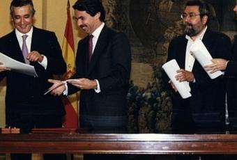 Fotografía de José María Aznar junto a los representantes sindicales de CCOO y UGT. A diferencia del gobierno anterior, el PP durante su primera legislatura logró importantes pactos con los distintos agentes sociales