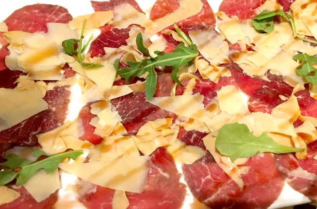 · Carpaccio de carne, lascas de fue, parmesano y rúcula aderezado con cítricos y sal de charco que estaba espectacular. No le pongo ningún pero, porque nos encantó.