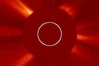 Arriba: Animación realizada a partir de 18 imágenes tomadas por el Coronógrafo Espectrométrico de Gran Ángulo (LASCO) de SOHO. LASCO bloquea la luz solar para poder obtener detalles de la corona. El círculo blanco representa el diámetro del Sol. Crédito: NASA/ESA/SOHO.Más información: