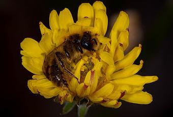 No es la primera vez que me encuentro como una escena como la de la fotografía, una abeza dormitando plácidamente en una flor. En este caso, la abeja estaba tan quieta que llegué a pensar que estaba muerta, ya que después de hacerle una foto, la pata del trípode golpeó con la flor y la abeja se cayó al suelo, quedándose quieta durante unos segundos. Pero para mi sorpresa, luego empezó a moverse y completamente atontanda se tambaleó un momento y al cabo de unos minutos se subió a una hierba más alta y se fue volando.