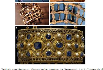 El trabajo con láminas y chapas Las coronas y las cruces de Guarrazar muestran buenos ejemplos de la capacidad de los orfebres para recurrir a diferentes soluciones en función del tamaño, el peso y la ornamentación de los objetos, desde piezas de estructura relativamente simple, hasta objetos de gran complejidad técnica, cuyo mejor exponente es la corona de Recesvinto. En el grupo de las coronas, la de chapa simple de Cluny es la de estructura más sencilla.Su banda está formada por un cilindro simple dividido en dos mitades unidas por charnelas (Fig. 6, 2), cuyos bordes se reforzaron hacia el interior con una cinta laminar soldada. El exterior de la diadema está decorado con tres bandas paralelas de engastes con cabujones, que se distribuyen en aparente desorden en cuanto a sus formas y colores. En los bordes superior y exterior del cilindro se disponen tramos de hilos moldurados soldados que imitan esferillas (Fig. 6, 1).