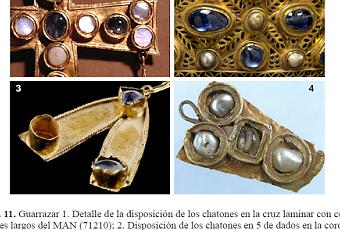 Los engastes de la cruz de estructura calada de la corona de Recesvinto (Fig. 12) constituyen un caso aparte. Tienen forma de templete con columnas vegetales, cuyo capitel termina en unas patillas que sirven para sujetar a los zafiros (Fig. 12, derecha).Las perlas situadas en los extremos de los brazos se sujetan mediante un hilo de oro enfilado por una perforación que las atraviesa, un sistema que al igual que los engastes anteriores, está bien documentado la orfebrería bizantina. Sin duda, y a pesar de su asociación de origen a la corona de Recesvinto, nos encontramos ante una pieza tecnológicamente diferente y ajena al taller de Guarrazar, quizá elaborada por un orfebre bizantino, como ya se ha sugerido.