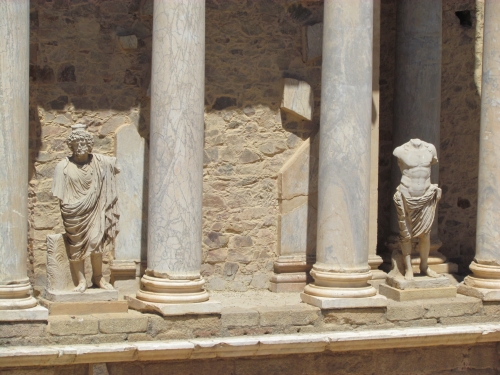 El frente escénico o escenario. El frente escénico se concluyó a mediados del siglo I bajo el mandato del emperador Claudio. La estatua colocada sobre la puerta central, fue hallada en febrero de 1922 y personifica a Livia, la esposa del emperador Augusto, pero representada como Ceres, diosa de la agricultura. Tanto esta escultura como el resto son copias. Los originales se conservan en el museo Nacional de Arte romano de Mérida.