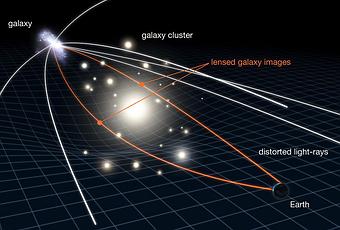 Esto significa que las fuentes de luz pueden aparecer en varios lugares de la misma imagen, mover sus posiciones a posiciones obvias o, lo que es más útil, amplificar su luz. Este último fenómeno se denomina «lente gravitacional», donde el objeto entre un objeto de fondo distante y la Tierra se denomina «objeto de lente».