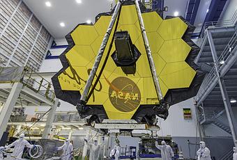 Los aficionados a la tecnología levantan el vidrio del Telescopio Espacial James Webb usando una grúa en abril de 2017 en el Centro de Vuelo Espacial Goddard en Greenbelt, MD. El sábado, el telescopio completó su misión final en el espacio.