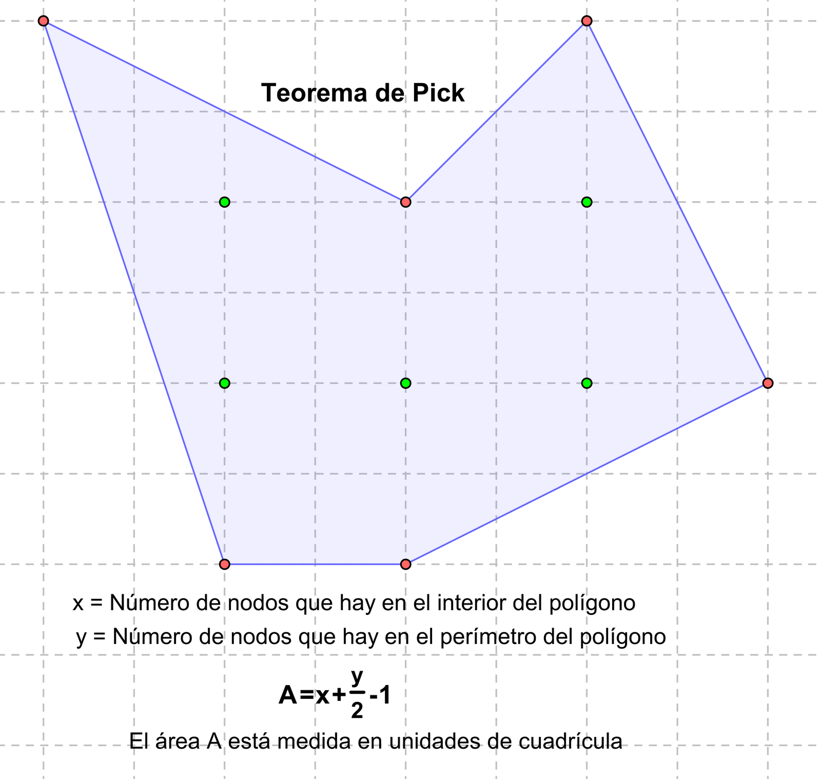 El área, se obtiene en función de los nodos de la cuadrícula que stán en el perímetro del polígono y de los que están en el interior del polígono, de la siguiente forma: Area = x + y/2 - 1, esto es "La suma de: El número de nodos en el interior del polígono y la mitad de los nodos que hay en el polígono. Menos 1".