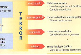 - En lo económico. Economía dirigida (control de precios, salarios, beneficios...), requisas, pena de muerte para los acaparadores, elevados impuestos a los ricos...