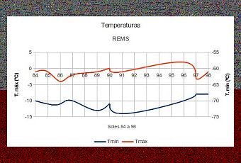 Por fin se ha superado el nivel de los 0º C, y es que durante el sol 96 se llegó a la temperatura de +2º C, aunque al sol siguiente descendería 5º C cayendo hasta los -3º C. Paradójicamente, este caída de las máximas coincidió con un aumento de la temperatura mínima, situándose en -68º C, temperatura que se ha mantenido también durante el sol 98.