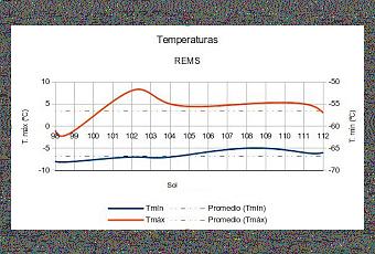 Parece que por fin nos situamos en un período de máximas por encima de 0º C. La máxima más baja la tuvimos durante los soles 98 y 99, que estuvieron por debajo de cero, pero a partir de esos soles, todas las máximas se han situado por encima de este nivel. Destaca la máxima alcanzada durante el sol 102, que fue de 8º C, récord de temperatura desde que Curiosity está en Marte. Las mínimas también han ascendido, teniendo un valor mínimo de -68º C (soles 98 y 99) y un máximo de -65º C (sol 108).
