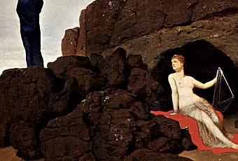 (Cuadro del pintor Arnold Boecklin, 1827-1901, Calipso y Ulises, 1883; Óleo del pintor actual español Guillermo Pérez Villalta, 1948, El rumor del Tiempo, 1984, Particular; Cartel británico de la película El Retrato de Jennie, 1948; Fotograma de la actriz Jennifer Jones en la famosa película Duelo al Sol, 1952; Fotograma de la película El Retrato de Jennie, 1948; Cuadro del pintor actual español Angel Mateos Charris, Futuro no, presente no, pasado, 1999; Autorretrato del pintor en su estudio, del pintor surrealista Arnold Boecklin, 1893; Cuadro del pintor Boecklin, Autorretrato con la Muerte y el Violín, 1872; Óleo La isla de los Muertos, 1883, de Arnold Boecklin.)