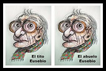 Y es que se daba la circunstancia que el tito Eusebio y el abuelo Eusebio habían sido como dos gotas de agua, tal era su extraordinario parecido. El tito Eusebio avanzaba casi a oscuras por el pasillo ataviado con el traje marrón del abuelo, su bufanda de cuadros, sus relucientes mocasines y, como no, con su bastón y aquellas gafas de gruesos cristales que se vio obligado a usar tras su operación de cataratas. Su entrada en el salón, hay que hacerse cargo, provocaba una pequeña catarsis.