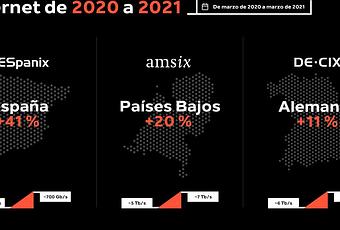 La aceleración de la economía digital se refleja en los gráficos de los puntos de intercambio de Internet (IXPs) de todo el mundo. Puntos de intercambio de tráfico, como ESpanix en España, han duplicado su tráfico de Internet entre marzo de 2020 y marzo de 2021. En el caso de ESpanix, se ha pasado de una media de unos 350 Gb/s a unos 700 Gb/s. Las estadísticas de otros grandes IXPs europeos, como AMS-IX en Países Bajos o DE-CIX en Alemania, también muestran un crecimiento notable; como se muestra en la infografía de Stackscale.