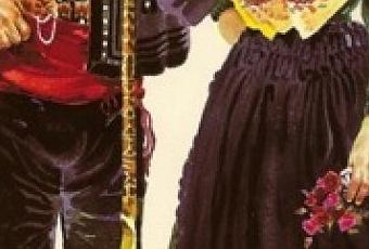 Chaleco: De franela, con motivos geométricos o de vaga inspiración floral sobre un fondo de color. Sin solapas, lleva ribetes de lanilla negra, cerrándose delante con ochos de trencilla que abrochan en pequeños botones a cada lado.