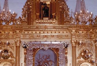 Hasta 1978, el triduo de la Divina Pastora se celebraba en su propio altar de la nave de la epístola de nuestra Parroquia. En 1976 la Imagen fue sacada del camarín para el triduo colocándose sobre su peana de plata, en esta fotografía de Estudio Rincón, vemos el Altar dicho año con los respiraderos del paso formando un dosel en la embocadura del camarín. En la parte superior las arañas que fueron estrenadas en esa ocasión.