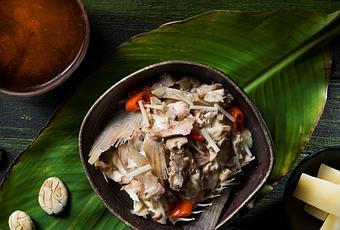 Cocine en agua el palmito finamente picado por tres ocasiones hasta que pierda el amargor. En una cuarta ocasión, agregue al palmito con agua las semillas de cacao blanco, la cachama picada, con sus escamas incluidas, ají y sal. Cocine todo por 20 minutos. Acompañe con yuca cocinada y chicha.