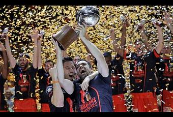 El capitán del Valencia Basket, Rafa Martínez (d), y su compañero, el base belga Sam Van Rossom, levantan la copa de campeones de la Liga ACB. (EFE).El Valencia Basket es el equipo de mi ciudad y de mi barrio, y se ha programado hoy por primera vez en su historia campeón de la Liga ACB con otra exhibición (87-76) ante el Real Madrid en el cuarto partido, la afición ha sido increíble como a animado en el pabellón de La Fuente de San Luis, donde cerraron el playoff final con 3-1.