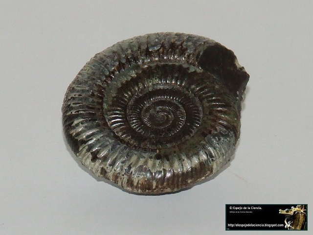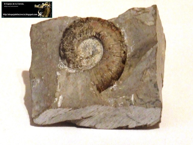 Cenoceras lineatum.Los Ammonoidea o Amonites se asemejan a primera vista a estos Nautilóideos más avanzados, de formas redondeadas y concha enrollada, aunque los Amonites presentan un caparazón comprimido lateralmente, sin que sea ésta la única característica que los distingue. Si existe un Género que realmente simboliza a estas criaturas éste es sin duda Dactylioceras, ello es debido a su gran abundancia en las tierras agrícolas del Reino Unido y Francia, donde los labriegos medievales los interpretaron como Serpientes petrificadas a causa de un milagro. Dactylioceras cuenta con ocho especies descritas hasta la fecha y en su mayoría habitaron los mares cálidos del Jurásico; el ejemplar que aquí puede verse procede precisamente del Condado de Yorkshire, Inglaterra, lugar donde se popularizó su mito.
