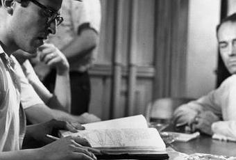 Además de todo lo demás, aquello que encumbra a “12 hombres sin piedad” (Sidney Lumet-1957) como una obra maestra del cine universal es el inspiradísimo guión de Reginald Rose (al que presta mucha atención Sidney Lumet en la fotografía superior), cuya pluma de orfebre trenza un relato tan subyugante y veraz que es capaz de superar el angustioso condicionante de su escenario único, algo habitual en la escena teatral pero que en cine es pecado mortal. Y aun hay más: en el comportamiento de sus doce personajes podemos encontrar las claves que llevan a caminar por una vida que para todos no es otra cosa que un eterno negociar.
