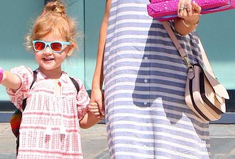 Un cumple infantil, tarde a pleno sol y hay que ir cómoda. Nos quedamos con el look: El vestido camisero a rayas de Jessica Alba y bandolera.