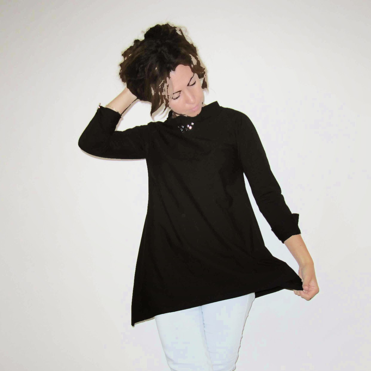 En esta foto podéis apreciar que la parte delantera es mas corta. La idea que tenía era hacer un vestido desigual, un lado más largo que el otro, pero por problemas con la lejía y un corte sin patrones (rollo la porta mágica) al final los dos lados me han quedado iguales. Además lo que había sido un vestido de largo aceptable ha acabado siendo una camiseta leggins jejejePensándolo bien, y mirando las reglas básicas del reto, creo que con esta forma me lo pondré mucho más, para trabajar, salir, etc... (es mi consuelo)