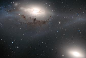 Aunque los centros de estas dos galaxias lucen similares, sus partes exteriores no podrían ser más diferentes. La galaxia en la parte de más abajo a la derecha, conocida como NGC 4435, es compacta y parece estar desprovista de gas y polvo. En contraste, en la galaxia grande en la parte superior a la izquierda (NGC 4438) se ve un sendero de polvo oscuro justo sobre su núcleo; también se pueden ver estrellas jóvenes a la izquierda de su centro y el gas se extiende al menos hasta los bordes de la imagen.