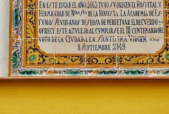 En la Calle Hiniesta, frente a la puerta del Convento de Santa Isabel podemos ver este azulejo en el que se recuerda el IIIº Centenario del voto que la ciudad de Sevilla hizo a la Virgen de la Hiniestan.