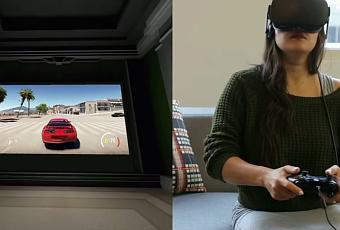 Lo que se ve es una especie de sala virtual con una gran pantalla donde se ve el juego, así es, nada de realidad virtual, si no, una sala virtual solamente.
