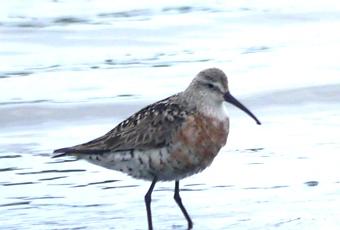 Tan sólo andaba por la orilla izquierda de la playa, alimentándose en la rexa, un pequeño grupo de correlimos, todos comunes, excepto un ejemplar de correlimos zarapitín Calidris ferruginea, que ponía la nota de color, en este caso de un tono anaranjado.