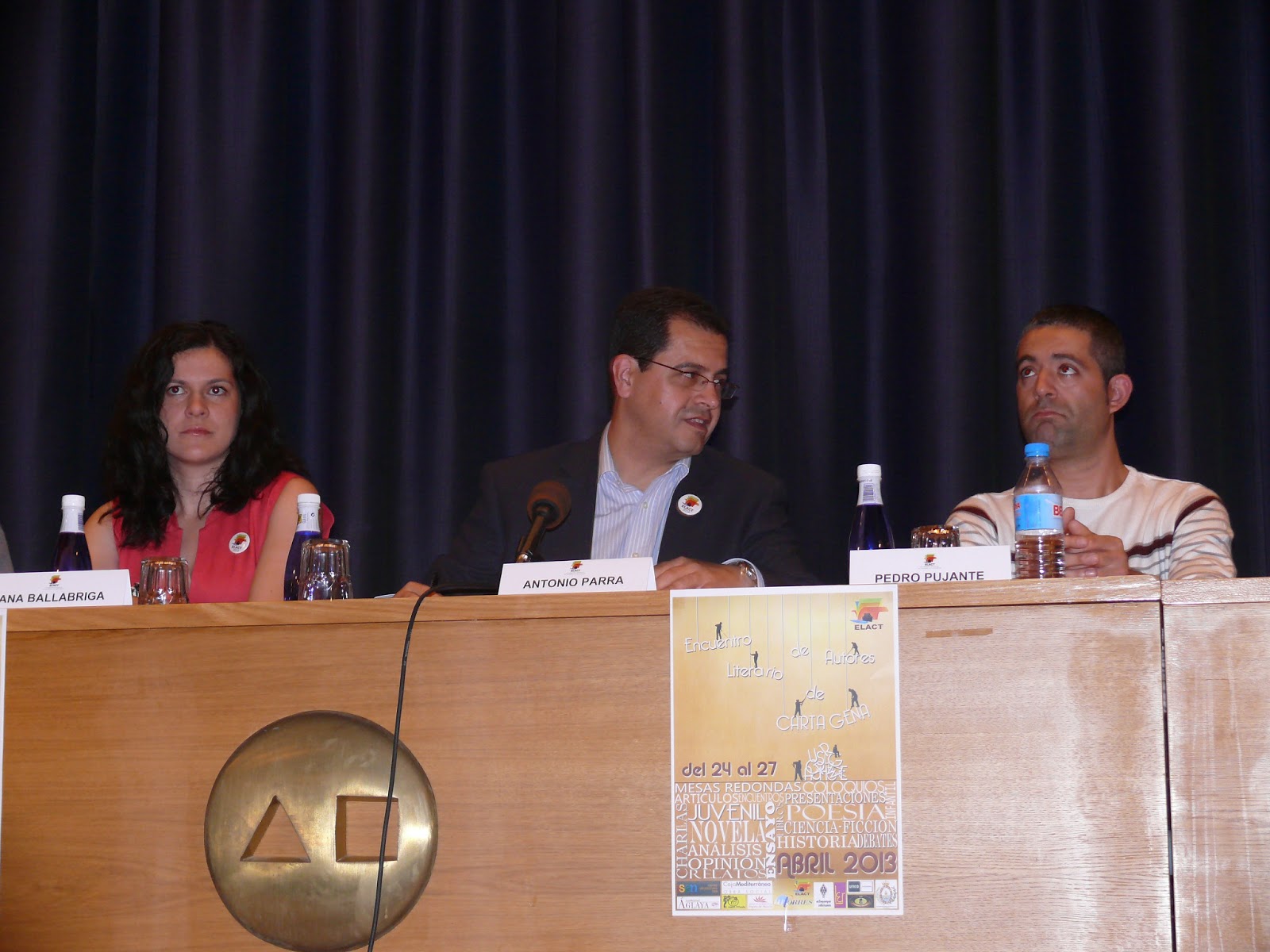 A las cinco de la tarde, como si el espíritu lorquiano hubiera decidido acompañar a este I Encuentro Literario de Autores de Cartagena, se inició la última de las mesas redondas, coordinada por Antonio Parra, y que acogió a un buen ramillete de nombres de la narrativa cartagenera, además de contar con la visita del autor murciano Pedro Pujante, quien desde que comenzaran los preparativos del encuentro se mostró muy interesado en participar en el mismo.