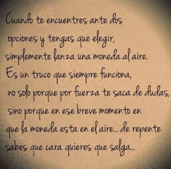 También, hay quien prefiere dejar la elección al azar, y utiliza el truco de la moneda: “si sale cara, SI; si sale cruz, NO.” No sé vosotros, pero yo misma muchas veces, después de lanzar la moneda al aire, he terminado eligiendo la opción que desde un principio quería.