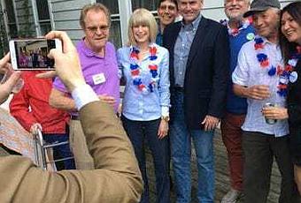 Scott Wallace, centro, un candidato para el Congreso, posa con los votantes en Morrisville, Pa. (David Weigel / The Washington Post)