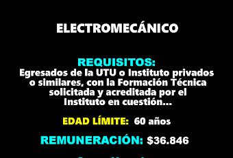 Requisitos Excluyentes:A. FORMACION:Egresados de la UTU o Instituto privados o similares, con la Formación Técnica solicitada y acreditada por el Instituto en cuestión.A VALORARA. FORMACION: Títulos, Cursos y Talleres de la especialidad requerida.B. EXPERIENCIA: 2 años mínimo en trabajos similares y de similar complejidadCOMPETENCIAS CONDUCTURALES Y/O FUNCIONALES- Trabajo en equipo- Respeto de la jerarquía- Planificación y organización